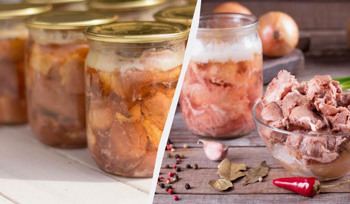 Waschen Sie das Fleisch, schneiden Sie es in mittelgroße Stücke und salzen Sie es. Zwei oder drei Erbsen Pfeffer und ein Lorbeerblatt in saubere Gläser verteilen. Dann das Fleisch fest in die Gläser legen.